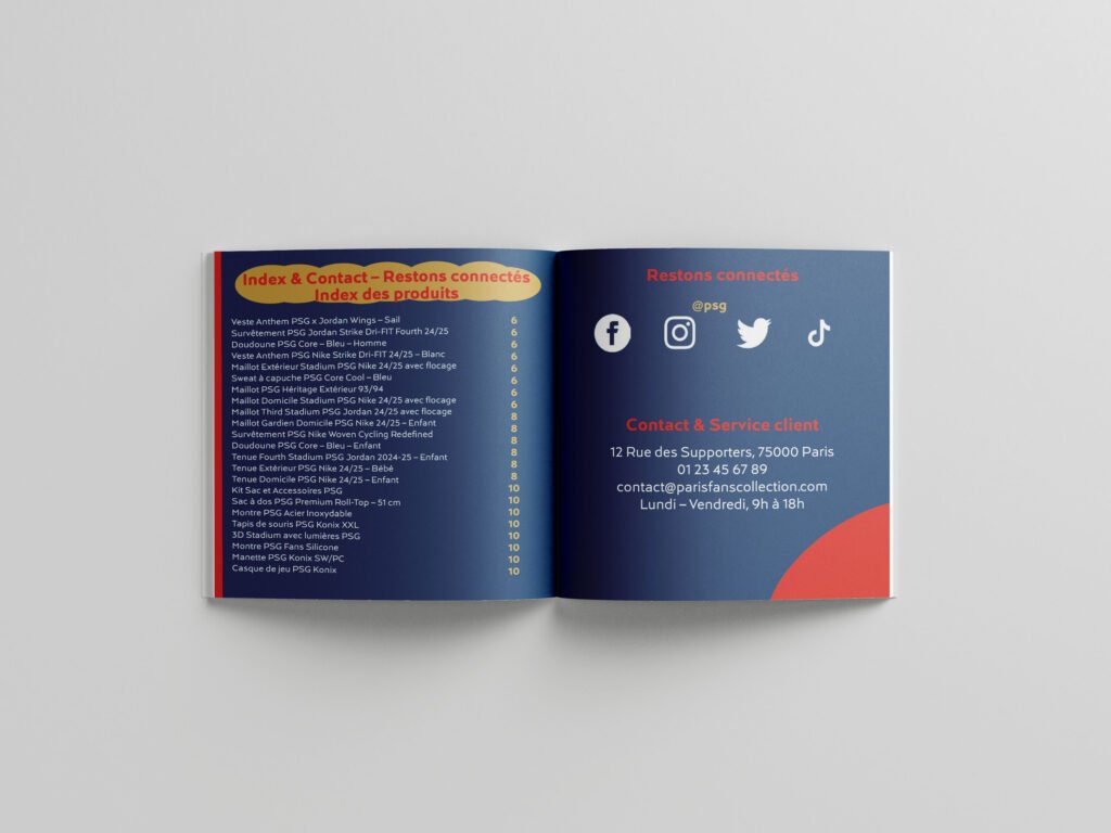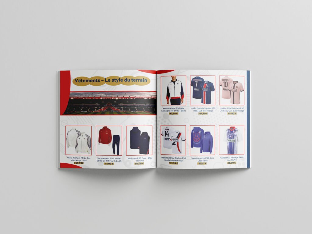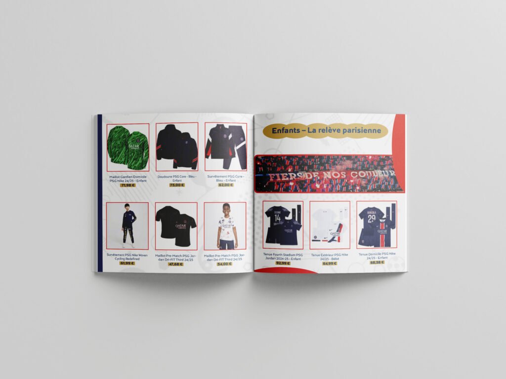 Ce catalogue met en valeur les produits, l’univers et les couleurs du PSG à travers une mise en page claire et un design moderne, inspiré de l’énergie du football parisien.