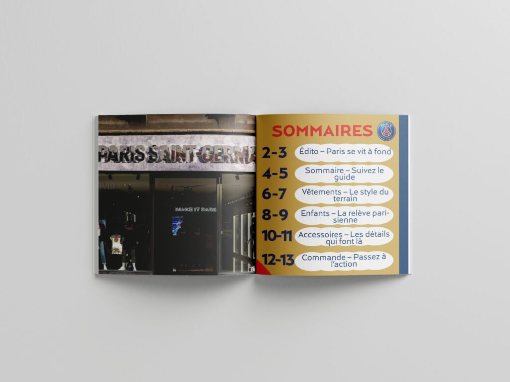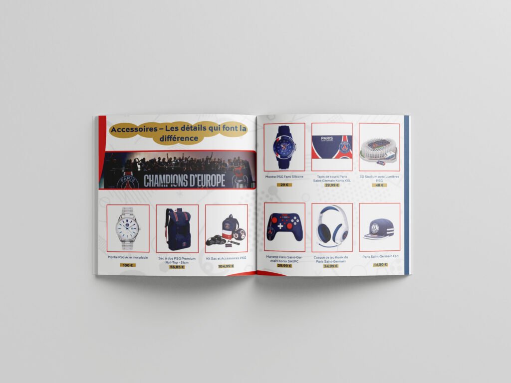 Projet de création d’un catalogue pour le Paris Saint-Germain. L’objectif était de concevoir un support dynamique et visuellement impactant, reflétant la passion, l’identité et l’exigence du club.